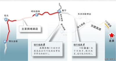 連日來,受大貨超載、車多、修路等因素影響,京藏高速重現(xiàn)大擁堵,上萬車輛滯留,內(nèi)蒙古境內(nèi)堵車路段更是長達120公里。與京外情況相比,110國道西關環(huán)島至延慶段的進京和出京方向交通都較為通暢,未現(xiàn)擁堵現(xiàn)象。