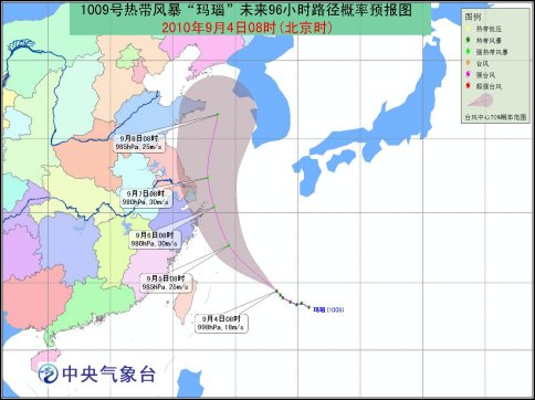 今年第9號熱帶風(fēng)暴“瑪瑙”于9月3日下午在西北太平洋洋面上生成,4日08時其中心位于浙江象山東南方大約860公里的洋面上,就是北緯24.4度,東經(jīng)128.3度,中心附近最大風(fēng)力有8級(18米/秒),中心最低氣壓998hPa。