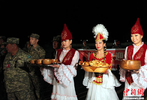在奧塔爾市火車站站臺上舉行的簡樸而隆重的歡迎儀式上,用中、俄兩種文字書寫的“熱烈歡迎‘和平使命-2010’聯(lián)合反恐軍事演習中方參演部隊”的橫幅格外醒目,哈方軍樂隊高奏中、哈兩國國歌,3位哈薩克斯坦盛裝少女手捧當?shù)靥厣拿谰、美食,獻給風塵仆仆的中方參演官兵。隨后,站臺另一側,中方參演部隊列車第一車隊攜行裝備,也在緊張有序地進行卸載。