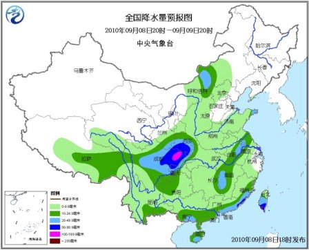 中新網(wǎng)9月8日電 據(jù)中央氣象臺預(yù)報(bào),未來三天,我國降水范圍較大,其中,西藏東南部、云南大部、四川盆地、川西高原中部、貴州西部和北部、重慶、甘肅東南部、陜西南部、湖北西南部、湖南西北部、廣西東南部、海南、內(nèi)蒙古中部、山東半島東部、江蘇中北部、安徽中南部、江西、浙江西部、福建、廣東大部、臺灣等地有大雨或暴雨,局部地區(qū)有大暴雨,上述部分地區(qū)并伴有短時(shí)雷雨大風(fēng)等強(qiáng)對流天氣。