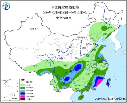 8日20時(shí)至9日20時(shí),西藏中東部、青海南部、甘肅南部、寧夏南部、陜西、內(nèi)蒙古中部、華北大部、黃淮、江淮、江漢、江南大部、華南以及西南地區(qū)等地有小到中雨或陣雨,其中,四川盆地、川西高原中部、甘肅東南部、陜西南部、重慶西部和北部、福建東南部沿海、廣東中東部沿海、臺灣中南部等地有大雨或暴雨,四川盆地東北部局地有大暴雨;內(nèi)蒙古中部、山東半島東部、蘇皖中部、江西西部、廣西東南部、海南南部等地的部分地區(qū)有大雨;上述局部地區(qū)并伴有短時(shí)雷雨大風(fēng)或冰雹等強(qiáng)對流天氣。新疆北部、甘肅西部、內(nèi)蒙古中西部和東南部等地有4~6級風(fēng)。受10號熱帶風(fēng)暴影響,臺灣海峽、臺灣以東洋面和以南海域、南海東北部有7~9級大風(fēng),風(fēng)暴中心經(jīng)過的附近海域風(fēng)力有10級,陣風(fēng)11~12級;東海南部有5~7級東南風(fēng)。黃海中北部有5~6級旋轉(zhuǎn)風(fēng);南海中部有5~6級西南風(fēng)。