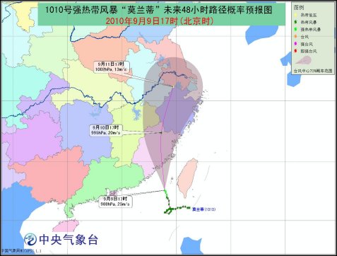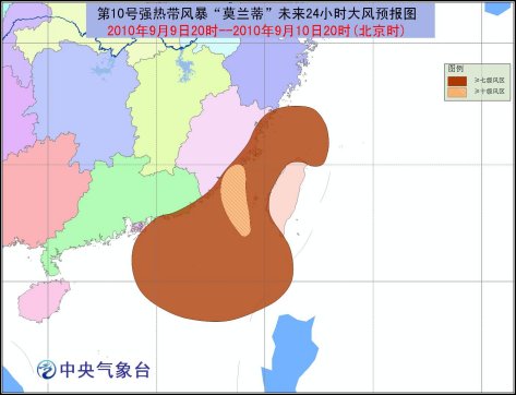 受熱帶風暴和西南季風共同影響,9月9日20時到10日20時,巴士海峽、巴林塘海峽、臺灣海峽、南海北部、臺灣西部和南部沿海、福建中南部沿海、廣東沿海將有7-8級大風,“莫蘭蒂”中心經過的附近海面或地區(qū)的風力有9-11級,陣風可達12-13級;浙江東部沿海和南部、福建、廣東中東部和西南部、廣西南部、海南、臺灣等地有大雨或暴雨,其中,福建東南部、臺灣南部等地局部有大暴雨。