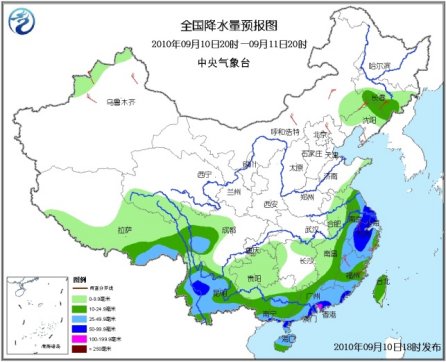 10日20時(shí)至11日20時(shí),新疆西北部、青海南部、西藏中東部、內(nèi)蒙古東南部、東北中南部、山東東部、江淮中東部、江南大部、華南、四川西部、重慶東南部、貴州、云南等地有小到中雨或陣雨,其中,江蘇東部和南部、上海、安徽東南部、浙江大部、江西東北部和東南部、福建西北部和南部、廣東大部、廣西南部、海南中北部、云南大部、川西高原南部、西藏東南部等地有大雨或暴雨,局地有大暴雨;上述地區(qū)局部并伴有短時(shí)雷雨大風(fēng)或冰雹等強(qiáng)對(duì)流天氣。新疆北部、內(nèi)蒙古東部、東北南部、華北東北部等地有4~5級(jí)風(fēng)。黃海南部海域有5~6級(jí)西南風(fēng)增大到7~8級(jí)的旋轉(zhuǎn)風(fēng),陣風(fēng)可達(dá)9~10級(jí);東海西部海域、臺(tái)灣海峽有7~8級(jí)偏南風(fēng),陣風(fēng)可達(dá)9~10級(jí);南海東北部海域、臺(tái)灣以東洋面和以南海域有5~7級(jí)西南風(fēng);黃海中部海域?qū)⒂?~6級(jí)東北風(fēng)。