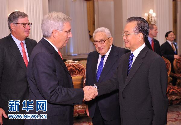 當(dāng)?shù)貢r間9月22日上午,在紐約華爾道夫飯店一間寬敞的會議室里,溫家寶總理望著坐在身旁的基辛格,以40多年來中美關(guān)系的發(fā)展入題,與美國企業(yè)、金融和學(xué)術(shù)界一些著名人士展開座談和交流。