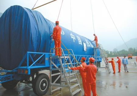 10:00,“全副武裝”的二級火箭從火箭測試廠房順利轉(zhuǎn)運到發(fā)射工位,停至塔下時,突然,天空烏云密布,過了一會兒,暴雨傾盆,吊裝隊人員忙不迭地將二級火箭推至塔架下面避雨,火箭吊裝工作被迫停止。