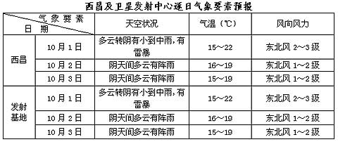 中國(guó)西昌衛(wèi)星發(fā)射中心的權(quán)威發(fā)布:“嫦娥二號(hào)”衛(wèi)星今天(10月1日)晚上即將迎來(lái)第一個(gè)發(fā)射窗口。預(yù)計(jì)今天空間天氣平靜,對(duì)嫦娥二號(hào)發(fā)射過(guò)程無(wú)不利影響;今天到4日,西昌市及衛(wèi)星發(fā)射基地以陰天或陰天間多云天氣為主,多陣性降水。