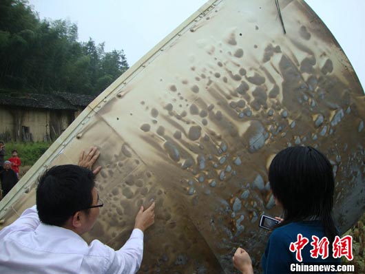 據(jù)當(dāng)時在湯湖鎮(zhèn)政府值班的武裝部張姓副部長介紹,1日晚19時11分許,傳來前后兩聲“砰”聲巨響,周圍幾公里有比較強(qiáng)烈的震感,當(dāng)?shù)厝罕姲凑諅鱽砺曧懙姆较蛘疫^去,分別發(fā)現(xiàn)兩塊整流罩,并立即報告鎮(zhèn)政府。