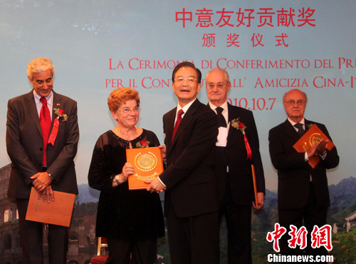 中新社羅馬10月7日電 (記者 周兆軍)中國(guó)總理溫家寶7日在羅馬向10位意大利友好人士頒發(fā)“中意友好貢獻(xiàn)獎(jiǎng)”,以表彰他們?yōu)榇龠M(jìn)中意關(guān)系發(fā)展所做的努力。