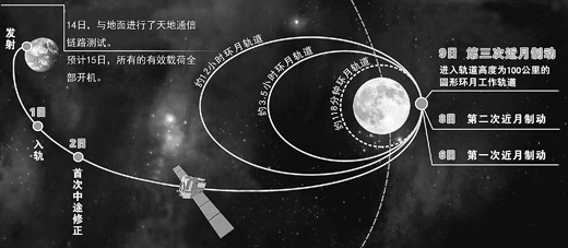 10月9日11時32分,嫦娥二號衛(wèi)星成功實施第三次近月制動,順利進入軌道高度為100公里的圓形環(huán)月工作軌道。按照預定計劃,嫦娥二號衛(wèi)星上搭載的有效載荷陸續(xù)開始工作,進行科學探測活動。