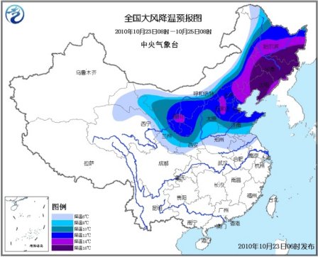 中新網(wǎng)10月23日電 中央氣象臺23日晨繼續(xù)發(fā)布寒潮藍色預警,寧夏中部、河北西部和東北部、內蒙古東南部、東北大部等地的部分地區(qū)降溫幅度可達14~16℃。