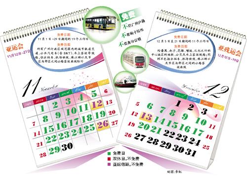 在亞運會及亞殘運會機動車單雙號限行的46天期間(11月1日至29日、12月5日至21日),剔除13個雙休日和3天亞運假期后的30個工作日里,廣州公共交通服務(wù)免費。