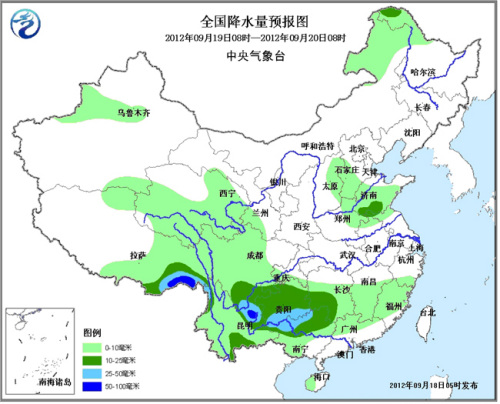 19日08時至20日08時,新疆沿天山地區(qū)、青藏高原中東部、西南地區(qū)、華南西部、江南西部、華北南部、黃淮大部、內(nèi)蒙古東北部等地有小到中雨或陣雨,其中,西藏東南部、云南東北部、貴州東南部、廣西西北部的部分地區(qū)有大雨,局地暴雨。東海南部海域、臺灣海峽、臺灣以東洋面將有5~6級、陣風(fēng)7級的東北風(fēng)。