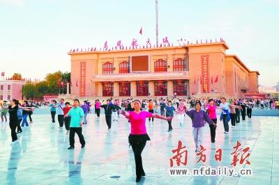 、诤教斐莾(nèi)東風(fēng)禮堂對(duì)面的廣場(chǎng)上的居民們載歌載舞。