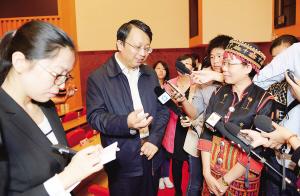 11月27日上午,全國人大常委會(huì)副秘書長(zhǎng)沈春耀在?谛v十八屆三中全會(huì)精神。圖為他和五指山市黎族干部交流如何貫徹十八屆三中全會(huì)精神提高農(nóng)民收入。本報(bào)記者 王凱 攝