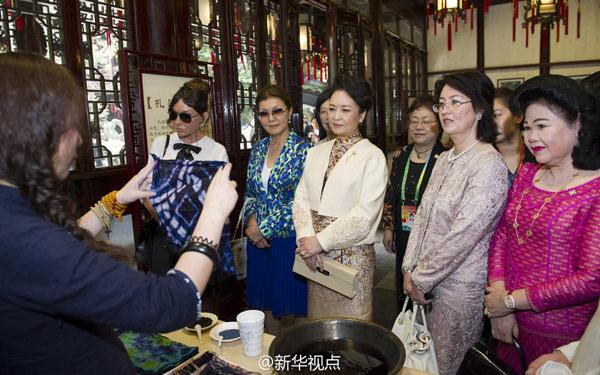 彭麗媛和貴賓們?cè)谠@靜觀的展臺(tái)前駐足停留,聽取介紹。彭麗媛不時(shí)拿起面塑、扎染布等傳統(tǒng)手工藝品給貴賓們欣賞!稗r(nóng)民畫用的是什么顏料?”“木版水印和版畫有什么區(qū)別?”“扎染布會(huì)褪色嗎?”……大家紛紛提問(wèn),同非物質(zhì)文化遺產(chǎn)傳承人親切交流。