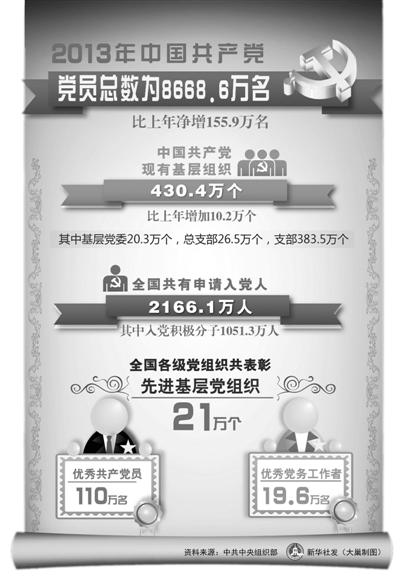 中央組織部最新黨內(nèi)統(tǒng)計(jì)數(shù)據(jù)顯示,截至2013年底,中國(guó)共產(chǎn)黨黨員總數(shù)為8668.6萬(wàn)名,比上年凈增155.9萬(wàn)名,增幅為1.8%;黨的基層組織總數(shù)達(dá)430.4萬(wàn)個(gè),比上年增加10.2萬(wàn)個(gè),增幅為2.4%。數(shù)據(jù)表明,中央關(guān)于黨員隊(duì)伍建設(shè)和基層黨組織建設(shè)的新部署新要求得到了較好落實(shí)。