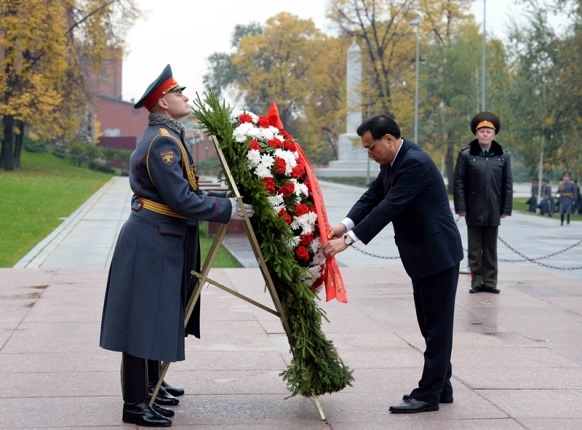 俄方為李克強(qiáng)總理安排的第一場(chǎng)正式活動(dòng)就是向克里姆林宮外的無名烈士墓獻(xiàn)花圈,意涵豐富深刻。