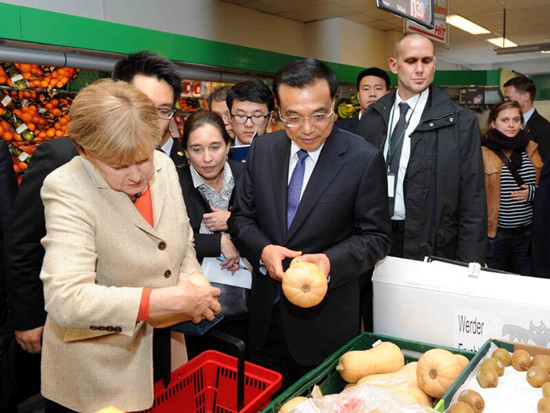 在默克爾的總理府檢閱完儀仗隊(duì),在紅地毯的盡頭,默克爾微微笑,抬起右前臂,伸出大拇指——這是對(duì)李克強(qiáng)的一個(gè)贊賞?這個(gè)小動(dòng)作饒有趣味。在默克爾領(lǐng)李克強(qiáng)去她經(jīng)常逛的一個(gè)超市,李克強(qiáng)要去拿提籃,默克爾擺手制止了他,她自己熟練地拎上提籃,自然而然引領(lǐng)著李克強(qiáng)走上自己熟悉的逛超市線路。很顯然,無論你是否在意他們的職務(wù),他們之間的關(guān)系是老熟人,是朋友。國與國之交往,私人之間的友誼,正是象征,不可忽略。