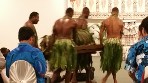 喝完卡瓦汁,斐濟(jì)原住民又把烤豬、芋頭什么的抬上來啦,一人還上前致祝福語。習(xí)大大點(diǎn)頭致意。斐濟(jì)禮賓官代表習(xí)大大接受獻(xiàn)品并致謝。然后,原住民將食物抬下。