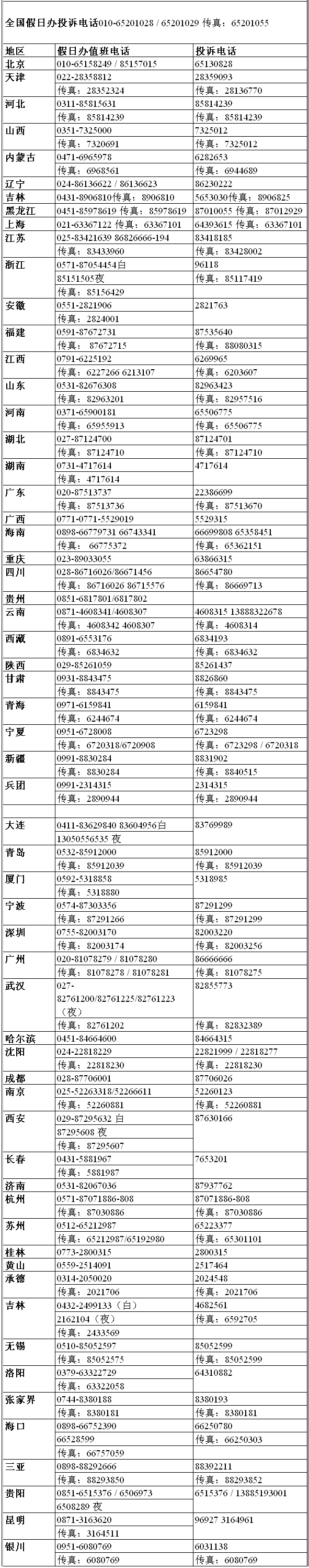 中新網9月26日電 今天,全國假日辦公布了2006年“十一”黃金周各省(區(qū))市假日旅游協(xié)調機構的旅游投訴電話。具體見下表——