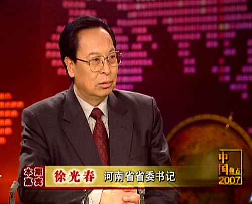 好,接下來我們繼續(xù)來關注新農村建設的話題。今天在演播室我們非常容幸地邀請到中共河南省委書記徐光春先生。您好,徐書記。