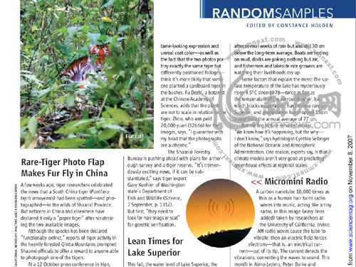 11月8日13時,新民網(wǎng)聯(lián)系位于美國的《科學(xué)》雜志總部詢問刊登華南虎照的真實動機,但因時差關(guān)系至新民網(wǎng)截稿時,《科學(xué)》尚未對此問題作出官方回復(fù)。11月9日,新民網(wǎng)在業(yè)內(nèi)人士的幫助下,第一時間在《科學(xué)》官網(wǎng)上獲取到本期雜志的電子版。在Constance Holden(康斯坦斯·霍盾)編輯的“Randomsamples”(隨機樣本)欄目中,第一篇新聞報道刊出了周正龍的照片。