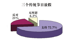 據(jù)統(tǒng)計,昨天上午方案公布至22時,五大網(wǎng)站共有約45萬名網(wǎng)民參與了調(diào)查。投票結(jié)果顯示,近九成網(wǎng)民支持國家法定節(jié)假日總天數(shù)由10天增加到11天,七成多的網(wǎng)民支持增加清明、端午、中秋三個傳統(tǒng)節(jié)日為國家法定節(jié)假日,八成網(wǎng)民支持保留十一國慶節(jié)和春節(jié)兩個黃金周,八成多的網(wǎng)民支持將春節(jié)放假時間提前到除夕,近八成網(wǎng)民支持將元旦、五一及三個新增法定假日與前后周末調(diào)整成連續(xù)三天的“小長假”,九成多的網(wǎng)民支持全面推行職工帶薪休假制度。
