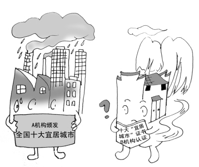 爭(zhēng)議之二,評(píng)選結(jié)果頻頻鬧出“烏龍”事件。最典型的例子是2005年,重慶市剛被某商業(yè)機(jī)構(gòu)高調(diào)評(píng)為“中國(guó)十大宜居城市”沒(méi)幾天,環(huán)?偩志统鼍邎(bào)告,認(rèn)定重慶屬于“十大污染城市”之列。