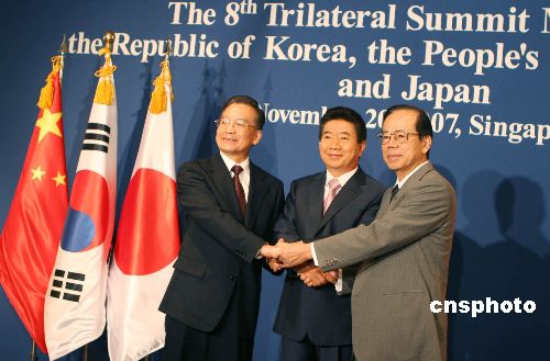 中新網(wǎng)新加坡11月20日電(記者 周群)第八次中日韓領(lǐng)導(dǎo)人會議今日在此間舉行。中國總理溫家寶、日本首相福田康夫、韓國總統(tǒng)盧武鉉出席會議。