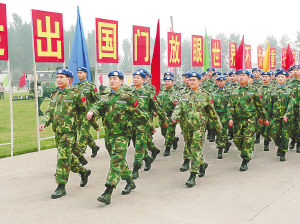 “走出國門,傳承文明友誼;維護和平,共建和諧世界!”一隊頭戴藍色貝雷帽、身穿迷彩服、胳膊上佩戴著“地球和橄欖枝”臂章的士兵踏著整齊的步點,喊著鏗鏘有力的號子,出現(xiàn)在筆者面前。