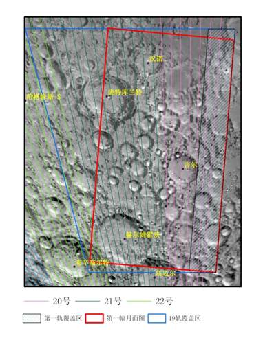 根據數據下傳質量,決定第一軌下傳的數據應該作為第一幅圖的成圖內容。為了保持物理上的第一幅圖與發(fā)布的第一幅圖一致,特別是考慮圖幅應以方正形式發(fā)布以達到美觀的目的。決定從11月20日16:49到11月22日7:57獲得的19軌數據中,挑選每軌的正視圖像,截取0~5000行數據,并最終完成了寬約280km、長約460km的第一幅圖的制作工作。