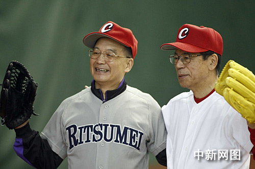 溫家寶身著35號球衣應(yīng)約和福田康夫切磋棒球球藝