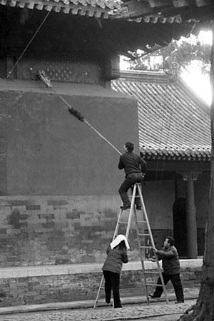 29日上午,記者進(jìn)入孔廟,發(fā)現(xiàn)工作人員正在對(duì)大中門(mén)、東華門(mén)等附近游客出入必經(jīng)的磚鋪甬道進(jìn)行精心修復(fù)處理。這些甬道都是由青磚鋪成,有的地方由于踩踏過(guò)多出現(xiàn)損毀或塌陷,工作人員都重新進(jìn)行了仔細(xì)地鋪裝整理。在奎文閣、碑亭等處,工作人員用加長(zhǎng)的雞毛撣子,拂去建筑墻體上的浮塵,使得古建筑更為鮮亮。