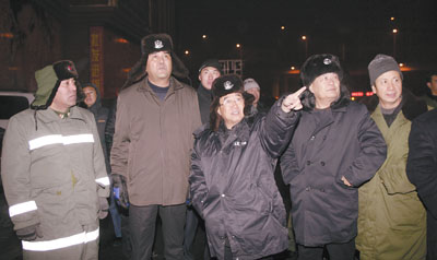 圖為新疆維吾爾自治區(qū)黨委副書記、自治區(qū)代主席努爾·白克力(左一),自治區(qū)黨委副書記、自治區(qū)常務副主席楊剛(右二),烏昌黨委書記、烏魯木齊市委書記栗智(右三),市委常委、市政協(xié)主席、市委秘書長黃公毅(右一)在火災現(xiàn)場指揮撲救工作。