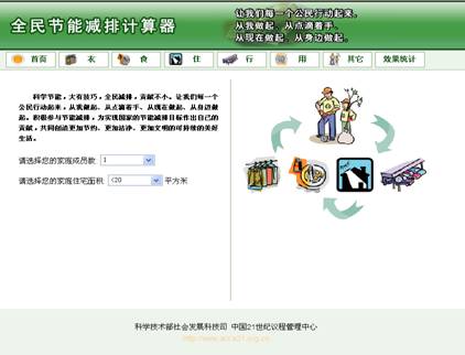 作為科技部、國家發(fā)展改革委、中宣部等六部委聯(lián)合推動的“節(jié)能減排全民科技行動”的重要內(nèi)容之一,在科技部社會發(fā)展科技司、中國21世紀議程管理中心的組織下,在中科院地理科學(xué)與資源研究所的專家們在其承擔的“十一五”國家科技支撐計劃項目課題“公民節(jié)能減排潛力指標體系”研究成果的基礎(chǔ)上,開發(fā)完成了“全民節(jié)能減排計算器”。