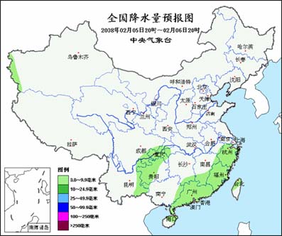 5日20時至6日20時,新疆西南部、浙江北部、江西東北部、云南東北部等地陰有小到中雪或雨夾雪;湖南南部、江西南部、浙江中南部、福建大部、廣東、廣西東部、海南以及四川盆地南部、重慶大部、貴州中西部、云南東南部、臺灣等地陰有小雨,其中,貴州中西部的部分地區(qū)有凍雨。內(nèi)蒙古中東部、華北北部、東北地區(qū)、黃淮東部等地有4級左右偏北風(fēng);東部和南部海區(qū)有5~7級偏北風(fēng)。