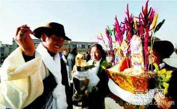 昨天,拉薩市城關(guān)區(qū)魯古居委會(huì)的居民在大昭寺廣場(chǎng)互敬象征五谷豐登的“切瑪”。西藏各族人民按照傳統(tǒng)習(xí)俗穿上節(jié)日盛裝,互敬象征五谷豐登的“切瑪”和哈達(dá)、青稞美酒,表達(dá)自己的祝福。