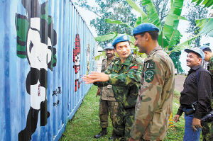 為了宣傳奧運,維和官兵在營院里面制作了各種各樣的奧運標志。充作庫房的集裝箱上噴繪的是福娃的形象,草坪中的一片空地上,則是官兵們用簡易器材做成的五環(huán)圖案和“Beijing2008”字樣。作戰(zhàn)組參謀張寶軍向前來參觀的外國友人一一作著介紹,還特別介紹了奧運會會徽標志代表的里程碑、承諾、形象、美麗、英雄、精神、邀請等七層含義。當?shù)亟逃齾f(xié)會的阿里特邊聽邊記,還將中國印和五個福娃的形狀畫了下來。聯(lián)剛團志愿者部門的卡爾松則連聲說,要調(diào)整假期到北京去看奧運會比賽……