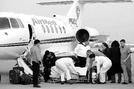 在新鄭國際機場的停機坪內(nèi),記者看到一架紅白相間的小型噴氣式飛機,機身上紅色十字的救護標(biāo)志十分醒目,飛機降落后,飛機內(nèi)的外籍機務(wù)人員和護士用專用的醫(yī)用擔(dān)架,將正在熟睡中的鄭麗抬下飛機,送上機場的120急救車,然后送往鄭州市內(nèi)一家醫(yī)院,整個過程用了半個小時。