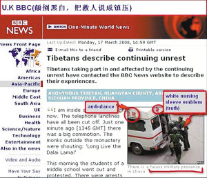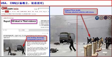 因此,“事件”初期,國際媒體上充耳塞目的是經過“精心”剪裁的照片和聳人聽聞的關于拉薩的報道。令人不解的是,在事發(fā)三小時內,中新社首發(fā)了兩張拉薩古城濃煙滾滾、民眾倉皇奔逃的即時照片,除了華人世界媒體廣泛采用外,可能只能躺在好多西方媒體圖片庫里呻吟了,要知道這是中國媒體最先發(fā)出關于拉薩事件中的第一聲“呻吟”啊,可能是人家剪裁起來不好下手吧!