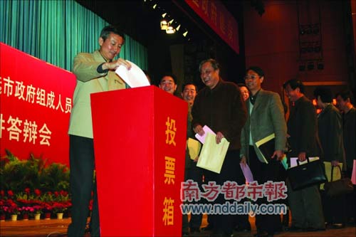 2月26日,南京舉行全市干部大會(huì),與會(huì)者包括南京市四套班子領(lǐng)導(dǎo)成員、出席過黨的十七大和江蘇省十一次黨代會(huì)的代表等,共300多人。會(huì)上,人手一張選票,選票上有51個(gè)“填空題”:填寫51個(gè)部門區(qū)縣一把手的推薦人選,其中包括南京市政府47名組成人員人選和4位區(qū)(縣)委書記人選。
