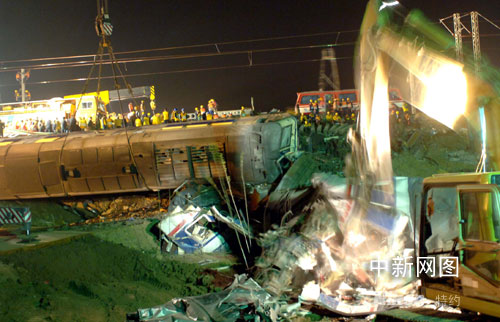 機(jī)器轟鳴、燈火通明、塵土飛揚,膠濟(jì)鐵路事故現(xiàn)場儼然變成了一個大工地。大約一千人,凌晨兩點多還在工作著。