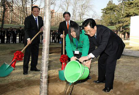 春天是播種希望的季節(jié)。胡錦濤專(zhuān)門(mén)來(lái)到中國(guó)人民大學(xué)百家園,同中日青少年代表一起種植友誼樹(shù)。