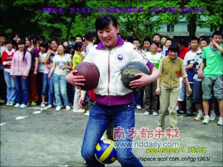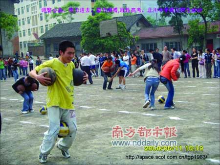 博客照片里在操場(chǎng)上歡笑的學(xué)生們,都是高三的孩子。地震前一天,高三年級(jí)搞了一個(gè)類似趣味運(yùn)動(dòng)會(huì)的活動(dòng)。唐老師說,高三的學(xué)生很久沒有這樣歡暢地玩過了,他們一直在為迎接高考而奮戰(zhàn)。那天距離高考只剩下了26天。北川中學(xué)是綿陽市的示范學(xué)校,每年的高考成績(jī)是北川的驕傲。