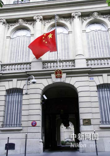 中國(guó)駐法使館為汶川遇難同胞降半旗。
