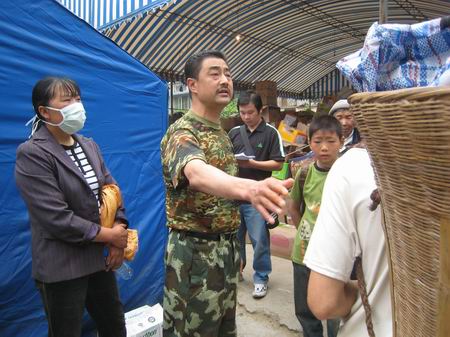 在北川抗震指揮部,有人告訴記者王洪發(fā)在上面,急急忙忙往上跑,找到了發(fā)放物資所在地。工作人員說,王洪發(fā)剛剛離開,北川醫(yī)院的女護士們這樣形容:“到下面去看,一個多高多帥的,穿迷彩服的就是。”再度跑到抗震指揮部,在帳篷里找到了王洪發(fā),他不停地分配任務,不斷接電話,記者無法插話。一邊接電話,王洪發(fā)一邊往民政局所在的帳篷走過去。半道上,桂溪鄉(xiāng)敬老院院長李元貴攔住了他:“敬老院現(xiàn)在還差帳篷!