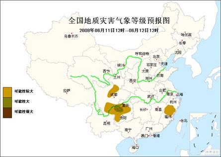 中新網(wǎng)6月11日電 據(jù)問天網(wǎng)消息,國土資源部、中國氣象局今天上午11時聯(lián)合發(fā)布地質(zhì)災(zāi)害氣象預(yù)報: