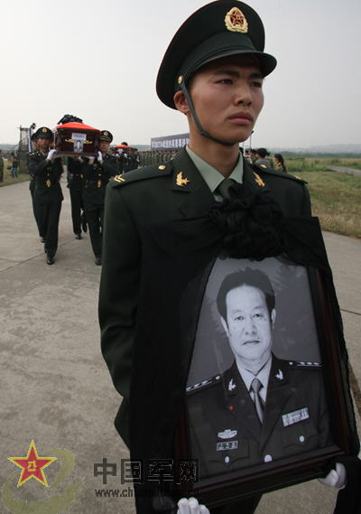 今天上午10時(shí)30分,運(yùn)送失事直升機(jī)機(jī)組成員靈柩的汽車,緩緩駛進(jìn)某陸航團(tuán)鳳凰山機(jī)場(chǎng)。迎送烈士靈柩儀式正式開始。