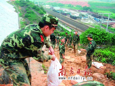 前日18時,京廣鐵路清遠龍?zhí)炼伟l(fā)生6處山體滑坡,直接威脅京廣交通大動脈的安全,廣東省清遠軍分區(qū)立即組織清城區(qū)民兵應(yīng)急分隊400多人連夜趕往搶險。