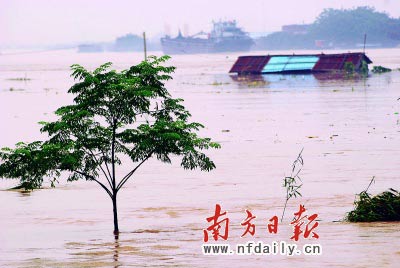 記者在鶯哥咀水文站附近看到,內(nèi)河堤內(nèi)的香蕉樹及其他一些防洪樹木,此刻全部被淹沒在洪水中,只露出樹梢在外面搖擺。在離水文站不遠處,一管樁廠也全部被洪水淹沒。一村民告訴記者,該廠的所有員工已于日前全部撤至安全地帶。